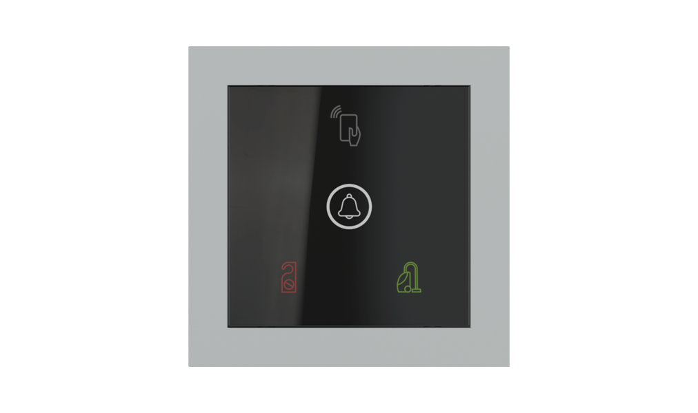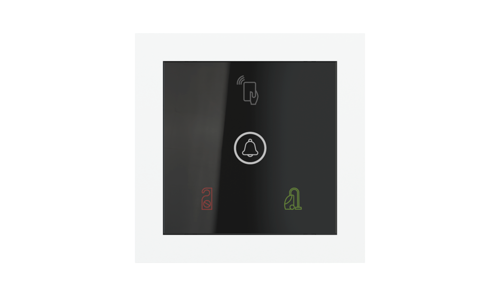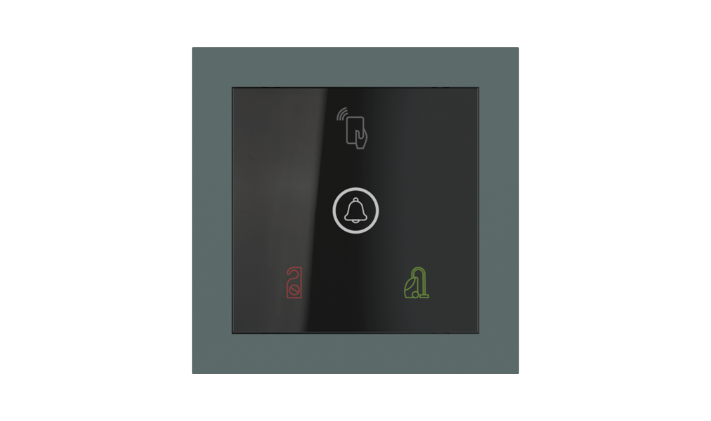 Venkovní čtečka, instalovaná u vstupu do pokoje, slouží k autorizaci hostů i personálu. Šifrovaná komunikace KNX Secure zajišťuje maximální ochranu proti neoprávněnému zásahu do systému. Podsvícený displej přehledně zobrazuje stavové symboly DND – Nerušit (červená LED) a MUR – Úklid pokoje (zelená LED). Součástí je také programovatelná RGB LED signalizace a integrované tlačítko zvonku.