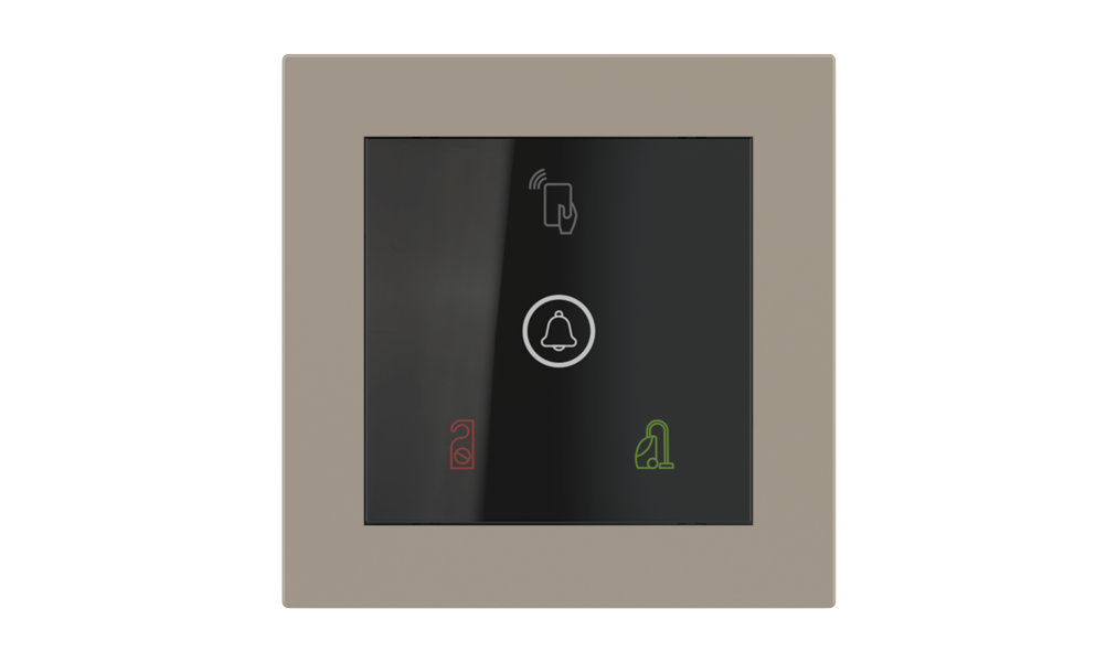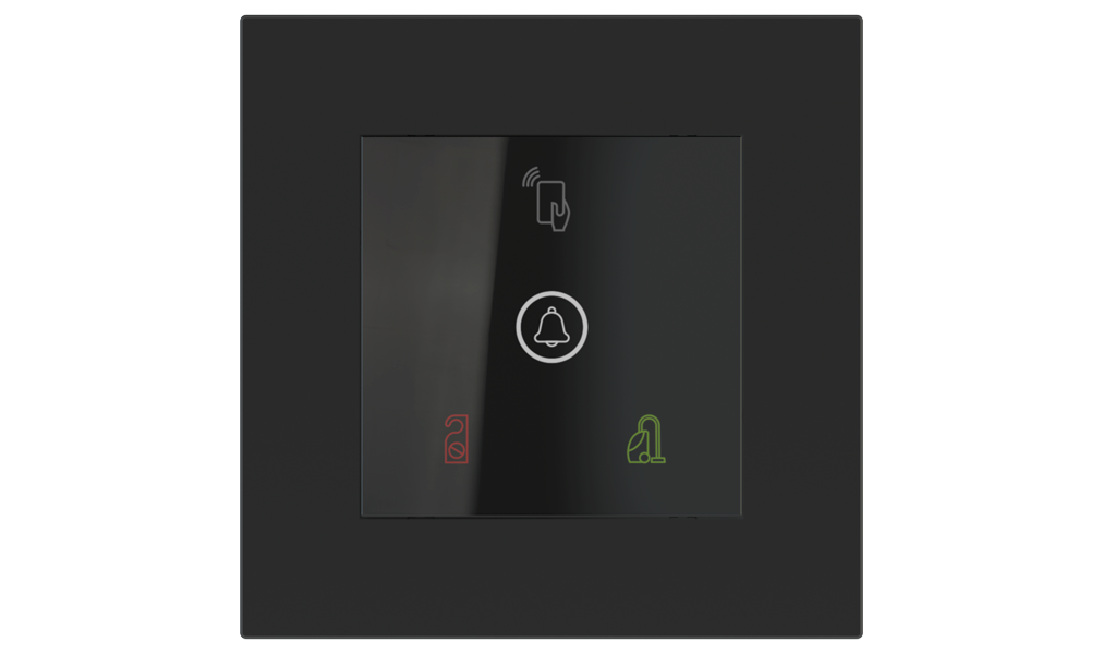 Venkovní čtečka, instalovaná u vstupu do pokoje, slouží k autorizaci hostů i personálu. Šifrovaná komunikace KNX Secure zajišťuje maximální ochranu proti neoprávněnému zásahu do systému. Podsvícený displej přehledně zobrazuje stavové symboly DND – Nerušit (červená LED) a MUR – Úklid pokoje (zelená LED). Součástí je také programovatelná RGB LED signalizace a integrované tlačítko zvonku.