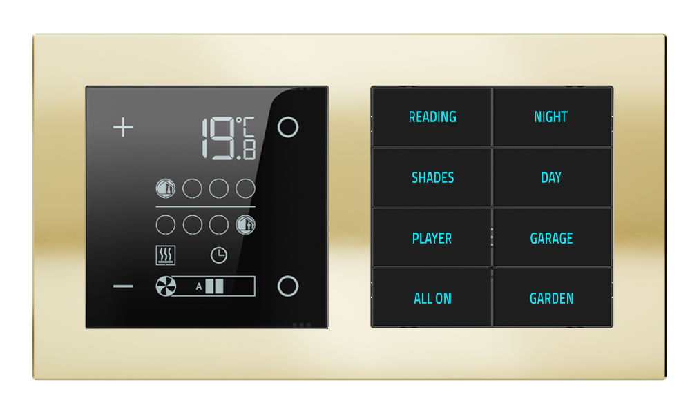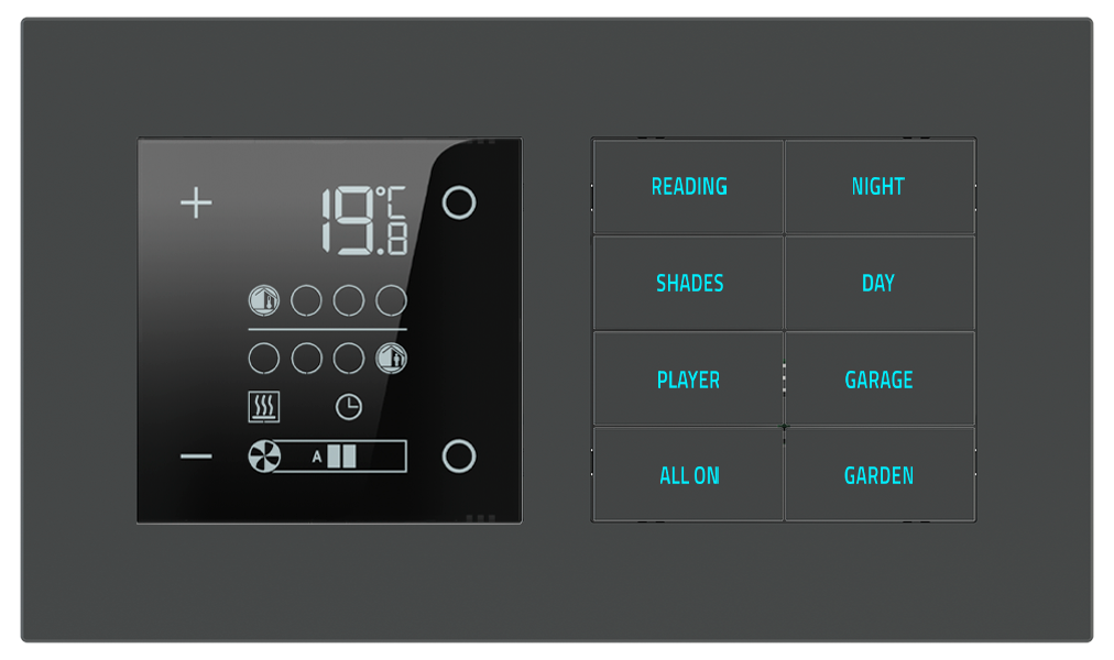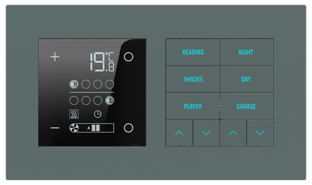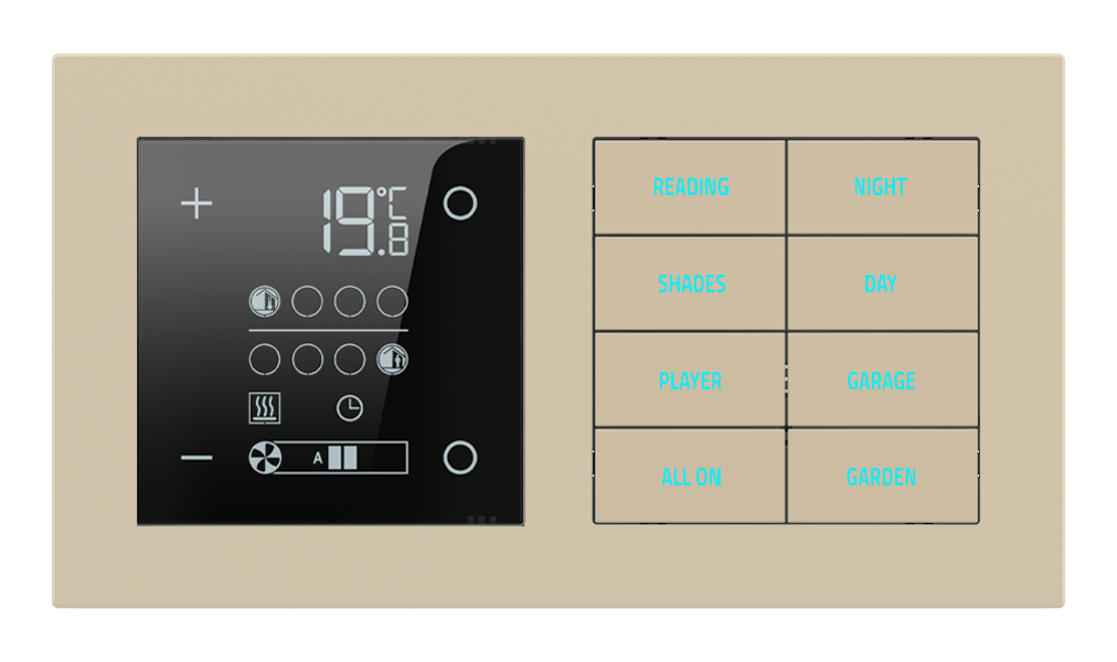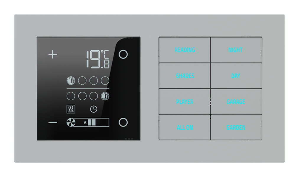 Termostaty řady 20venti jsou navrženy tak, aby po technologické i estetické stránce přirozeně doplňovaly ostatní ovládací prvky stejné série. Slouží k regulaci teploty v jednotlivých místnostech i celých zónách a stávají se nenápadnou, ale klíčovou součástí inteligentního interiéru.